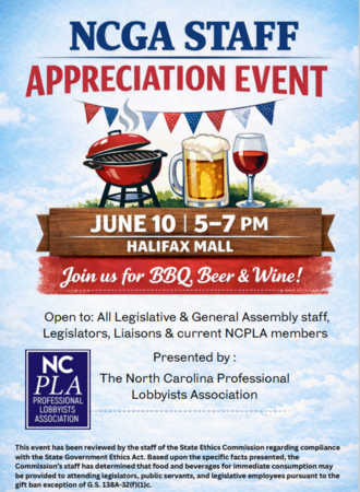 This event is our way of thanking the Legislative and General Assembly staff for all their work throughout session. We’ll be serving BBQ, beer/wine & more! The event is free and open to all legislative and general assembly staff, legislators, liaisons, and current NCPLA members. We expect a big crowd and hope to see you all there!